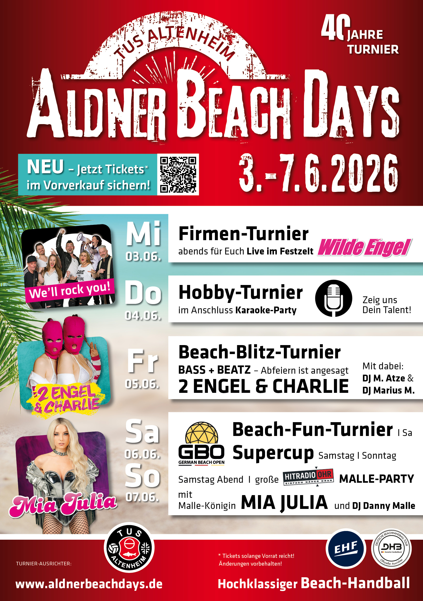 Ab Freitag 20. März: Tickets für die Abendveranstaltungen beziehungsweise das Festivalticket können unter aldnerbeachdays.ticket.io online erworben werden. NUR SOLANGE DER VORRAT REICHT. TEILNAHMEBEDINGUNGEN BEACHTEN!